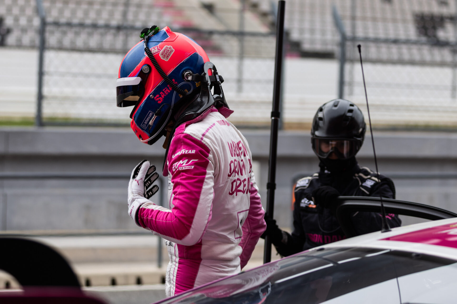 « oui, c’est sûr. Après, je crois aussi qu’il y a un avantage à être appelée en dernière minute, c’est qu’on n’a pas toute cette pression qui se construit pendant les semaines qui précèdent cette course-là. Donc moi, je suis vraiment arrivée un peu sur un petit nuage quoi. Je suis pas du tout arrivée avec cette espèce d’enclume de : waouh, je me suis préparée toute l’année pour cette course, j’ai le stress de bien faire, etc. Non, moi, je suis arrivée un peu en mode : au final, je peux pas vraiment mal faire. Ce qu’on attend de moi, c’est juste de faire mon boulot. Je sais dans quel rythme je suis au Mans. Je sais que j’arrive un petit peu en dernière minute et qu’on n’attend pas de moi que j’arrive et que je sois le leader de l’équipe. On me demande pas de remplacer Michelle, on me demande juste de venir et de faire le meilleur boulot que je puisse faire. Et au final, j’étais tellement heureuse d’être là que c’est ce que j’ai fait. Je me suis concentrée sur moi-même. J’ai eu le support de Raël et Célia pour bien m’intégrer dans l’équipe et tout. La chance de travailler avec un team comme Manthey, c’était assez dingue. Donc au final, c’est ça qui m’a aidée à gérer la situation. Mais je n’avais pas une énorme pression en arrivant. Moi, j’étais plutôt relax quoi. »