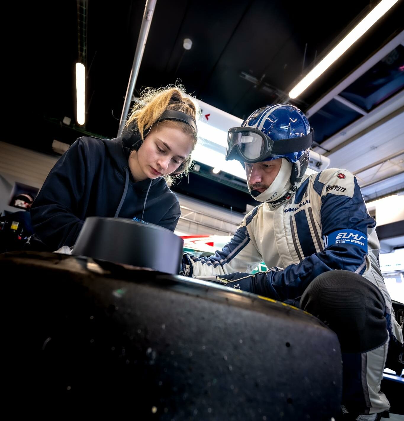 Pendant la course, j’ai un casque radio où j’entends les conversations des deux voitures, la LMP3 (Ligier JS P325) et la GT3. Dès que j’entends qu’il y a un réajustement de pression à effectuer, qu’il faut augmenter ou baisser la pression, je me dirige immédiatement vers les pneus concernés. Stéphane et moi nous retrouvons et c’est lui qui effectue le réajustement puisqu’il gère les calculs avec les ingénieurs. Pour ma part, je l’assiste et l’aide sur cette partie. »