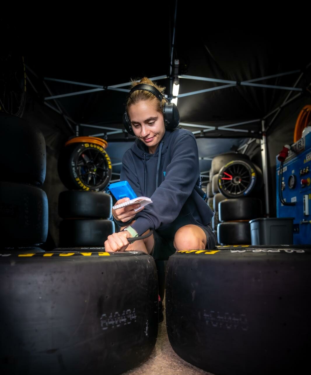« En meeting, effectivement, je travaille avec Stéphane Ocler qui est notre ingénieur pneumatique. C’est vraiment un beau privilège de travailler avec lui, c’est top. De mon côté, je m’occupe essentiellement de l’Aston Martin Vantage GT3 parce que cela demande un peu plus d’énergie : c’est plus physique que la LMP3 et surtout plus long à préparer. Le travail est aussi plus rigoureux, notamment parce qu’on utilise de l’azote, ce qui nécessite plus de temps et de précision dans la préparation des pneus. Je suis en totale autonomie sur la préparation des gommes. Pour tout ce qui est gestion des pneus, Stéphane me donne ses consignes : il me dit quels enveloppes il souhaite, pour quel jour et dans quelles conditions. On communique souvent par message avant même le début du meeting. Quand il arrive sur place, le montage est généralement déjà en cours chez Goodyear et je fais les ajustements nécessaires.