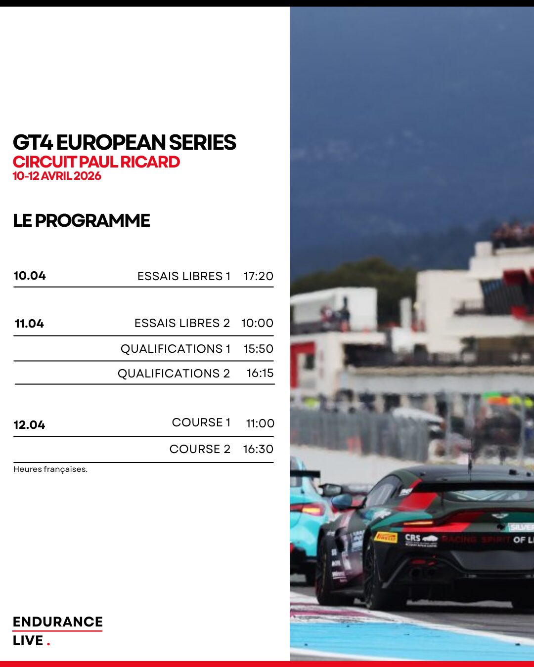 Ce week-end, les 11 et 12 avril, les 38 GT4 inscrites à la première manche de la saison 2026 se donnent rendez-vous dans le Var, au circuit Paul-Ricard. Endurance Live présente les forces en présence et le programme du meeting.