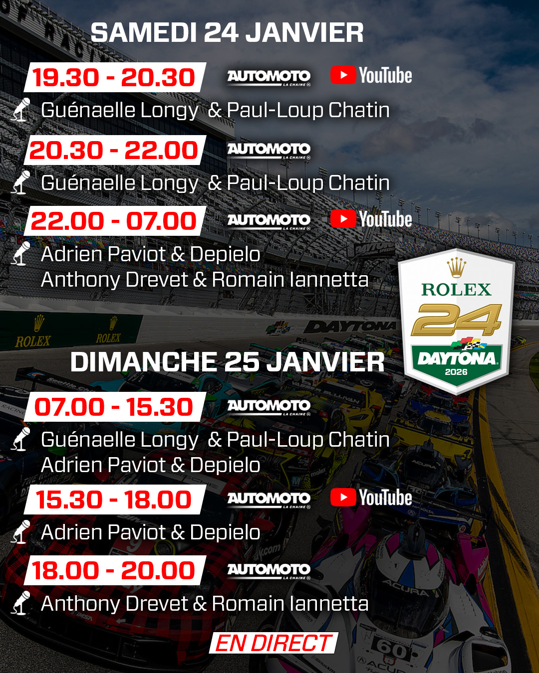 Une couverture intégrale est également proposée en anglais via IMSA TV et sur la chaîne YouTube officielle de l’IMSA :